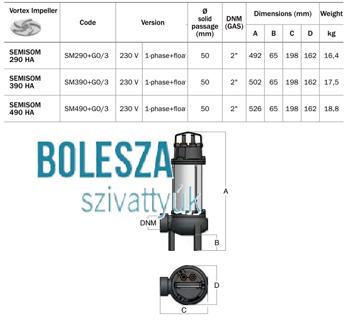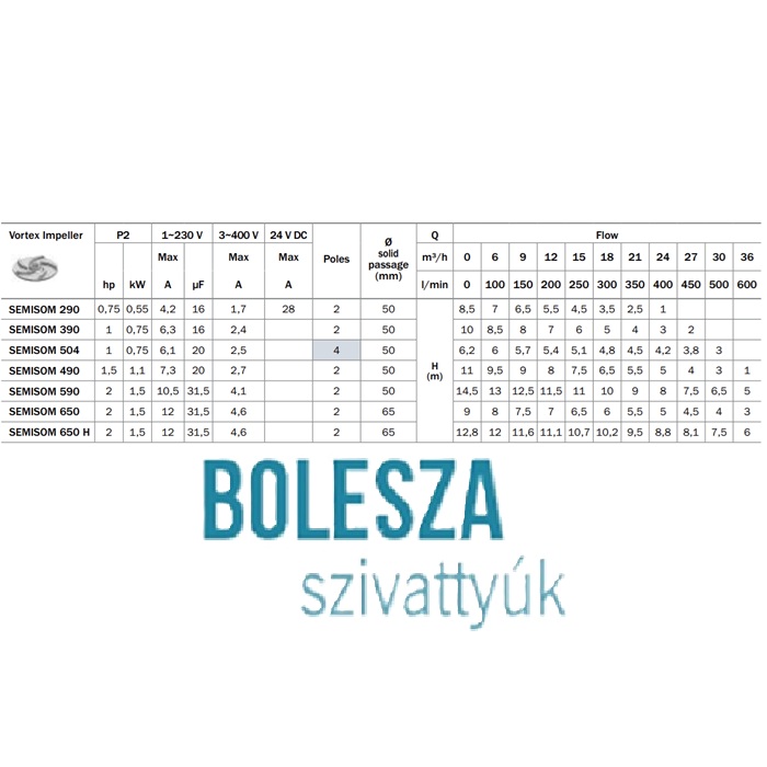 A SEMISOM Elektromos búvárszivattyúk háztartási, lakossági és ipari környezetben történő telepítéshez. Alkalmasak szennyezett víz, szennyvíz vagy szilárd testeket tartalmazó szennyvíz átemelésére max. 65 mm szemcseátmérőig. Ajánlott víz átemelésére, elárasztott tartályok vagy környezet víztelenítésére, víz elvezetésére a lefolyókból háztartási, polgári, ipari és pöcegödrök ürítésére akár eleveniszap jelenlétében is (4 pólusú változat).