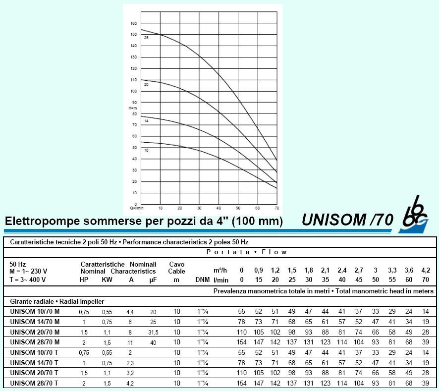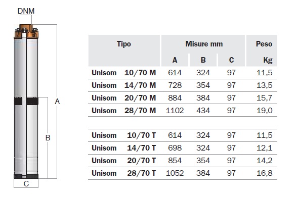 Ez az UNISOM réz szivattyúfejjel szerelt csőbúvár szivattyú olyan berendezés, mely már 100 mm átmérőjű fúrt kutak vizeinek kiemelésére alkalmas. A szállítandó víz koptató anyagot  nem tartalmazhat. A szivattyú középszívású, tehát szétbontható szivattyú részből és motorból áll, mely az egyszerűbb szervizelést segíti. A berendezést gyárilag 10 fm elektromos kábellel szerelték fel melyet külön kérésre vízmentesen a kellő hosszúságra tudunk toldani.