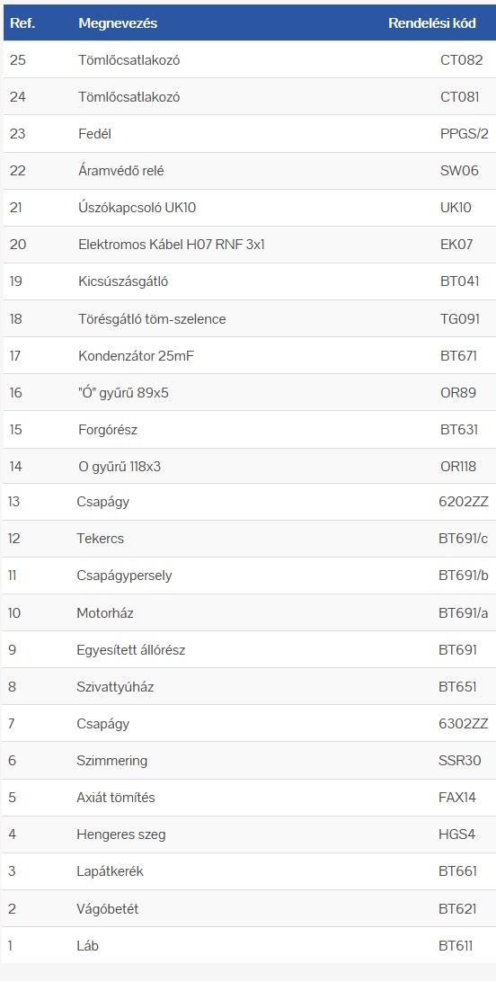 Az ELPUMPS BT6877K szivattyú valamennyi alkatrésze rendelhető, azonban a motor egy egységet képvisel, tehát a motorban található alkatrészek külön – külön csak részben rendelhetőek. A melléklet alkatrész listán és robbantott ábrán tudja beazonosítani a keresett alkatrészeket. Amennyiben bizonytalan, vagy műszaki segítséget szeretne kapni, úgy bizalommal forduljon Kollégáinkhoz. Igény esetén a szivattyú javítását is elvégezzük, aminek az átfutási ideje a mindenkori saját, illetve a gyártói raktárkészlettől és a szerviz letereltségétől függ. Kérem, hogy ezt javítási igény esetén vegyék figyelembe!