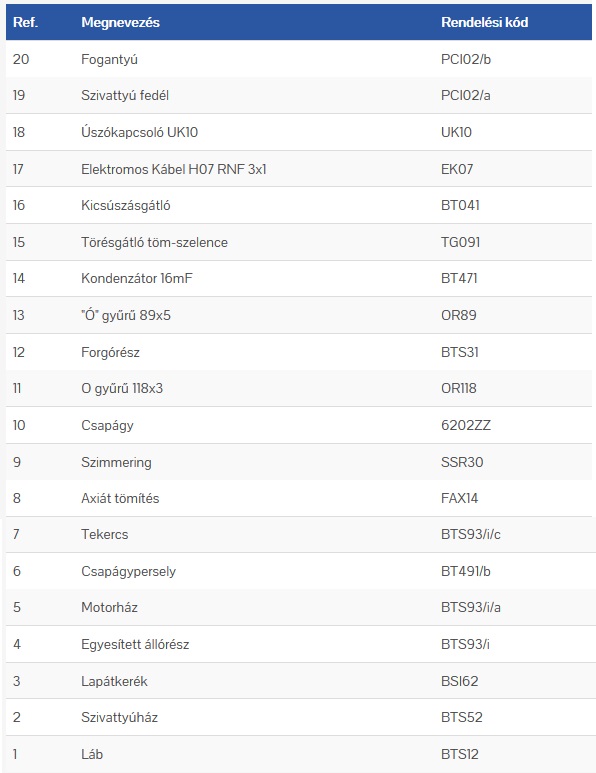Az alkatrészek pontos kiválasztásához, beazonosításához tekintse meg a szivattyú robbantott ábráját, vagy kérje Kollégáink segítségét!