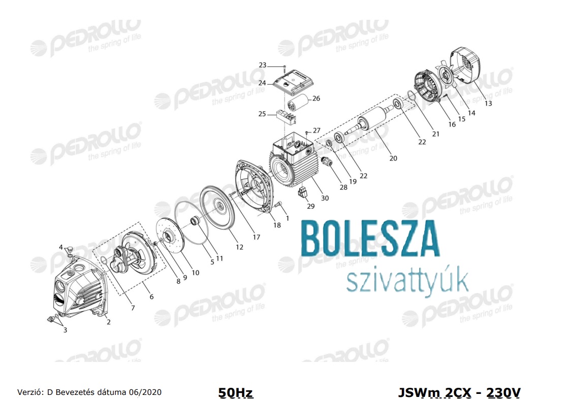 A PEDROLLO JSWm 2CX szivattyú valamennyi alkatrésze rendelhető, azonban a motor egy egységet képvisel, tehát a motorban található alkatrészek külön – külön csak részben rendelhetőek. A melléklet alkatrész listán és robbantott ábrán tudja beazonosítani a keresett alkatrészeket. Amennyiben bizonytalan, vagy műszaki segítséget szeretne kapni, úgy bizalommal forduljon Kollégáinkhoz. Igény esetén a szivattyú javítását is elvégezzük, aminek az átfutási ideje a mindenkori saját, illetve a gyártói raktárkészlettől és a szerviz letereltségétől függ. Kérem, hogy ezt javítási igény esetén vegyék figyelembe!