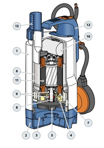 11 PEDROLLO motor: Egyfázisú 230 V – 50 Hz a tekercselésbe beépített hőkioldós védelemmel.
