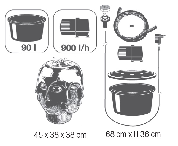 A művészi szobor este – a LED világításban – titokzatos hangulatot biztosít a kertben. A csobogó kiépítéséhez szükséges valamennyi elem, a medence, a fedőlap, a szivattyú, a LED világítás és a csatlakozó anyag a szett része.