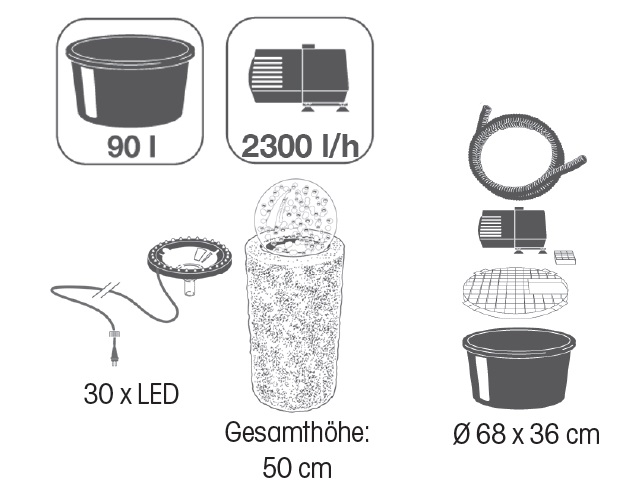 A földre süllyeszthető szett tartalmazza a telepítéshez szükséges valamennyi elemet, a medencét, a fedő rácsot, a szivattyút, a LED gyűrűt és a csatlakozó szerelvényeket és természetesen az opál üveggömböt.