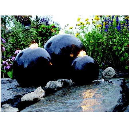 A labda fölé áramló megvilágított víz a felületen végig folyva egyedülálló hangulatot teremt, az éjszakai kertben